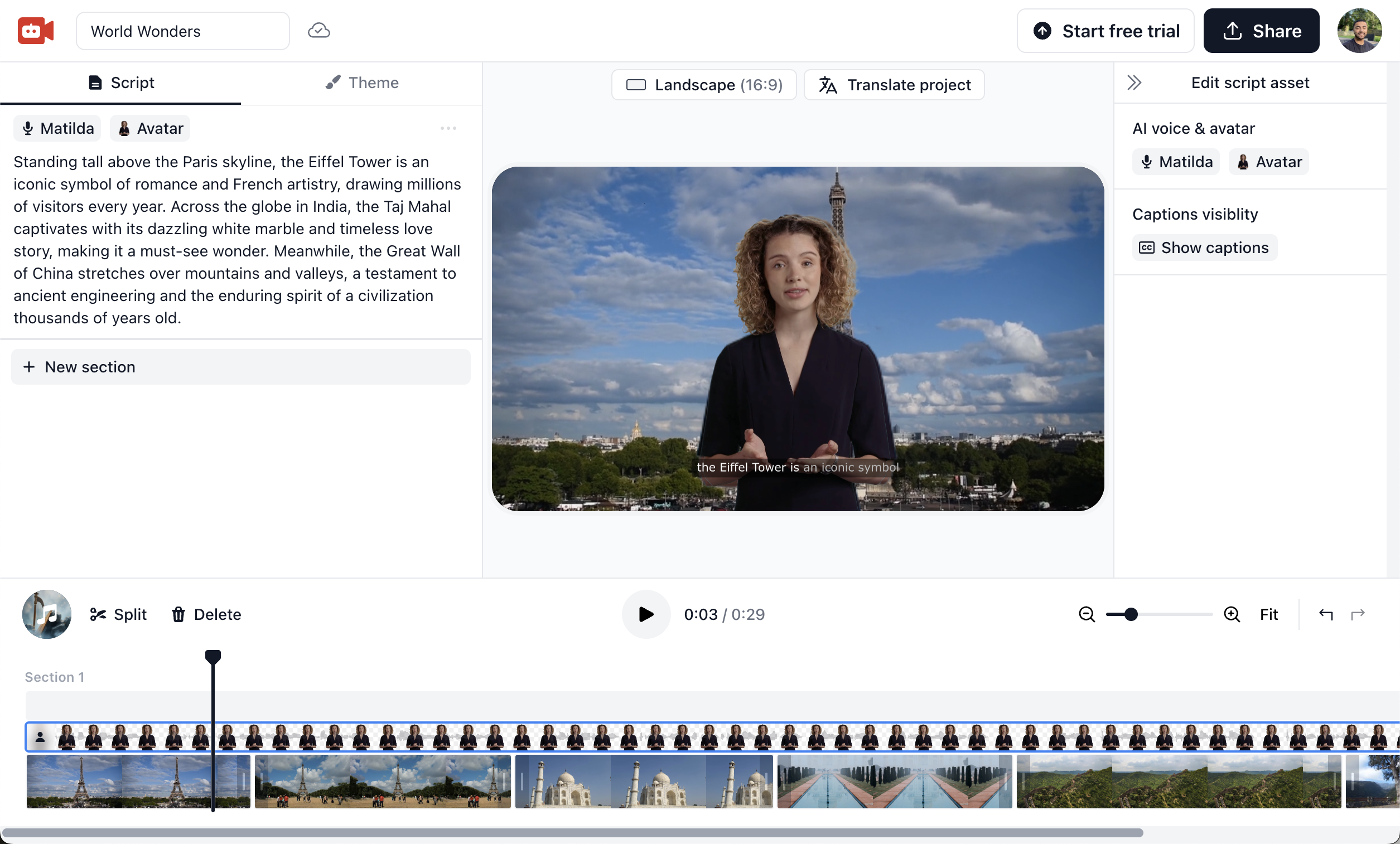 For context: VideoGen breaks up videos into sections. This allows you to regenerate or edit your videos in smaller chunks. Sections also synchronize the script with the timeline, allowing you to edit your entire video directly from the script.