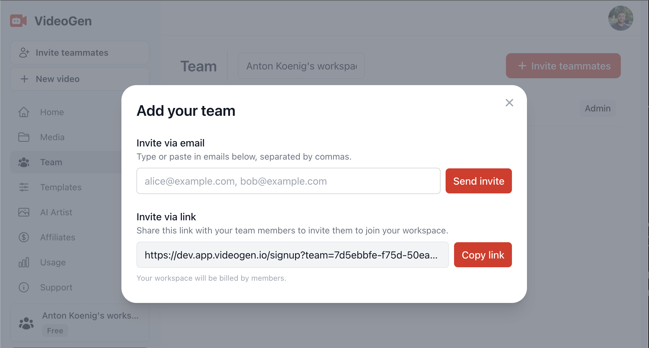 Inviting a teammate to your VideoGen workspace is as easy as clicking the "Invite teammates" button in the top left of your dashboard, or by navigating to the "Team" page. Simply copy and send the link to your collaborators, or enter their emails.