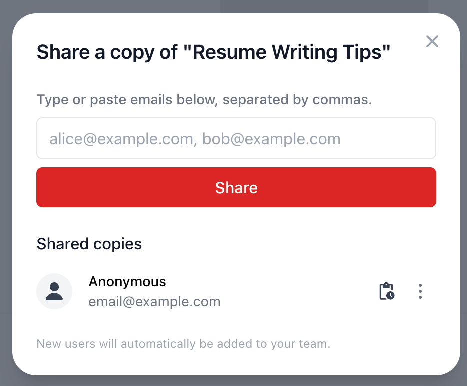 To share a copy of your video, simply click the "Share" button in the top right of a project and then click "Share a copy". Enter your collaborators' emails and click share!