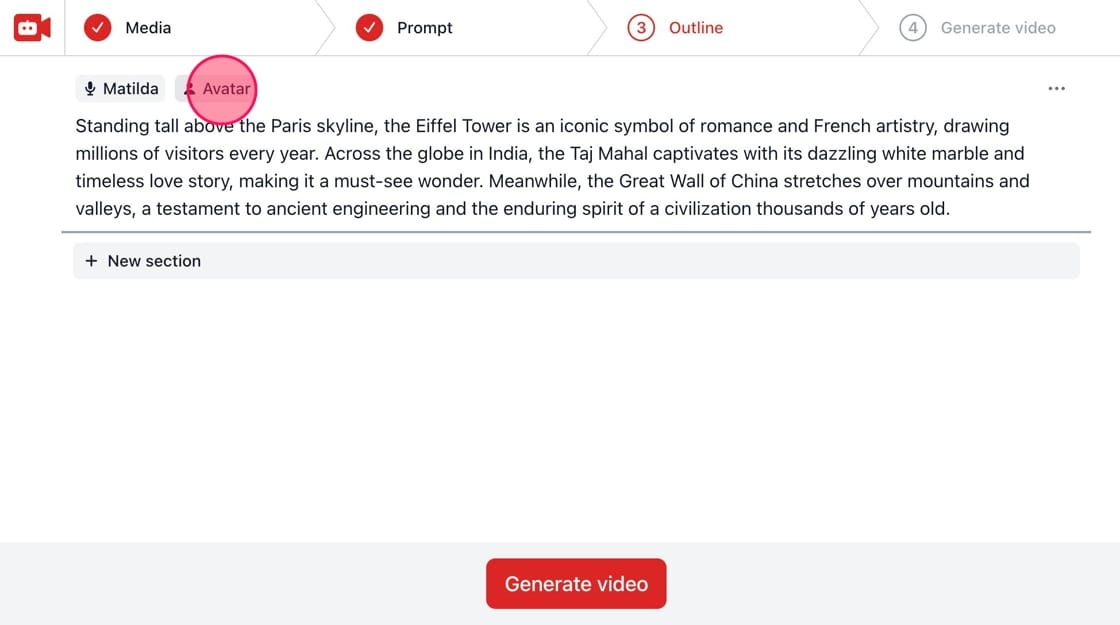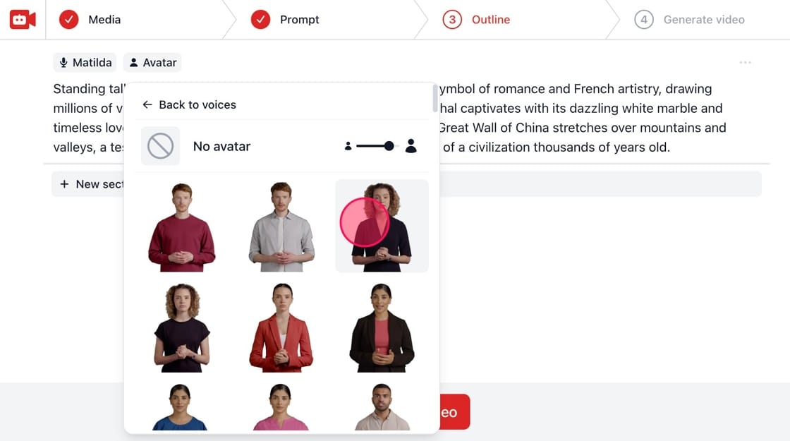- Click the "Avatar" option in the outline. You can customize or change the avatar and voice for each section in your outline.