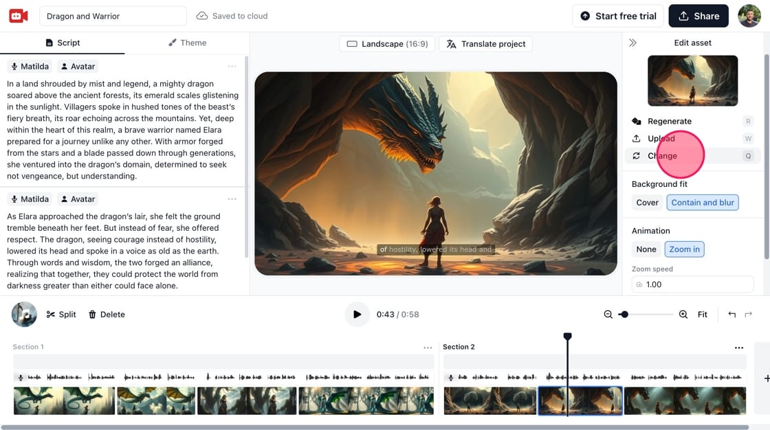 - Open a project. Select an asset in the timeline and click "Change" in the right-hand sidebar.