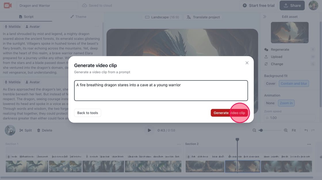 - Enter a prompt and click "Generate video clip". Each clip will be 8 seconds long, but you can trim or extend them in the timeline.