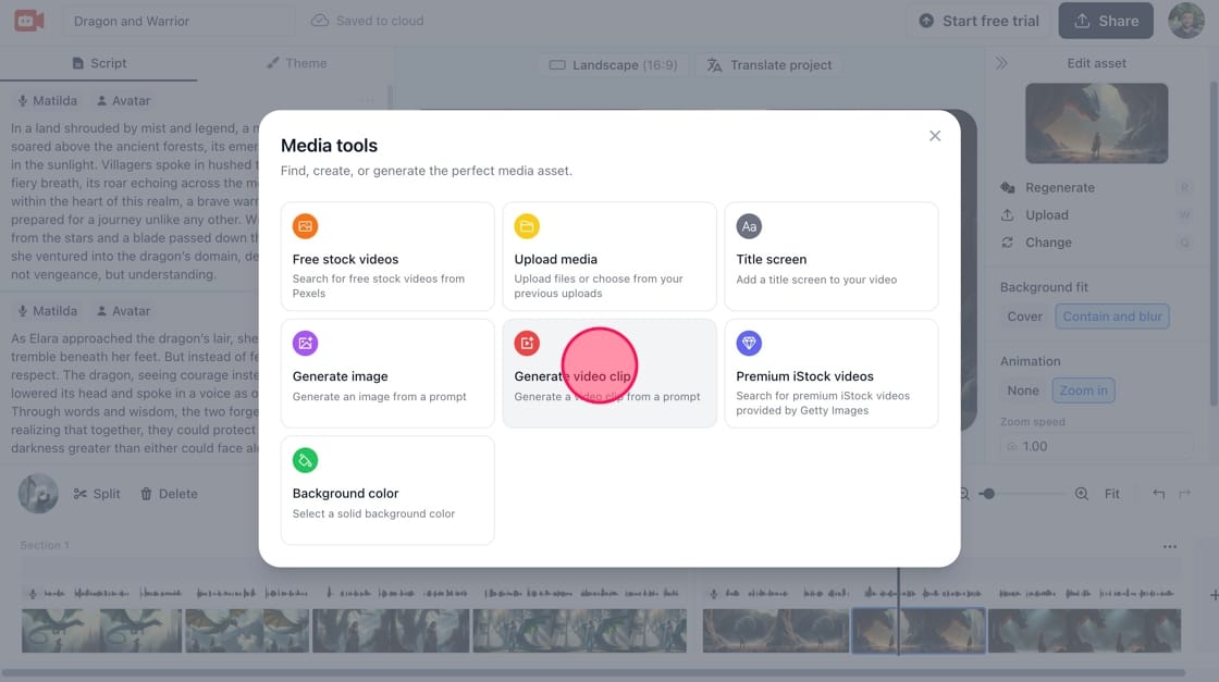 Our new AI Agent, built directly into VideoGen, does just that. It combines your uploads, AI visuals, and stock footage into a seamless timeline, matching your script’s tone, pacing, and story.